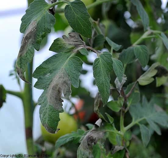 P. infestans peut s'attaquer à tous les organes aériens de la tomate en plein champ comme sous abri. Les symptômes apparaissent à la fin du printemps et en été et ils évoluent rapidement en période humide. Sur les folioles, il est responsable de taches d'abord humides et mal définies qui se développent assez rapidement, conférant localement au limbe une teinte vert pâle à vert brun (figures 1 à 3). Des portions importantes du limbe sont touchées, et les tissus ne tardent pas à se nécroser. Ces taches sont fréquemment entourées d'une marge de tissus livides où se forme parfois un discret et fugace duvet blanc (figure 4). Lorsque les conditions sont particulièrement humides, la progression des symptômes sur le feuillage peut être fulgurante, de nombreuses feuilles brunissent et se dessèchent assez rapidement (figure 5). Bon nombre de plantes finissent par mourir.