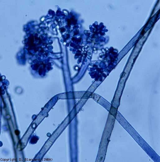 Ajoutons que les lésions se couvrent généralement d'une moisissure grisâtre à beige très caractéristique (figure 4). Celle-ci est constituée par les très nombreux conidiophores arbusculeux du champignon, qui produisent d'innombrables conidies (figure 5).