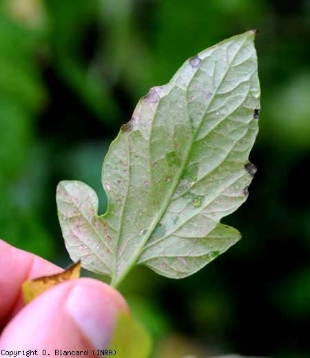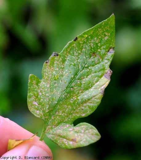 Des lésions argentées, de taille et de forme irrégulières, apparaissent sur le limbe ; elles se nécrosent progressivement et prennent une teinte beigeâtre (figures 2 à 4). Ces lésions sont aussi parsemées de minuscules points noirs matérialisant les déjections des thrips . Les folioles affectées ont tendance à se chloroser et prennent une teinte terne. Des chutes de fleurs peuvent avoir lieu. Les sites d'oviposition de F. occidentalis sur les jeunes fruits, apparaissant sous la forme de lésions punctiformes brunes, sont entourés par un large anneau blanchâtre sous-épidermique (figure 5). Parfois, les fruits plus ou moins déformés présentent des lésions liégeuses linéaires (figure 7).