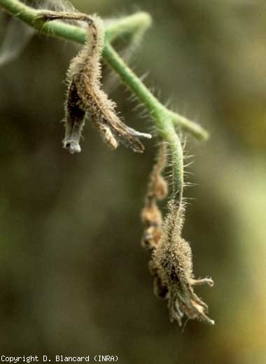 Les pétales sénescents sont particulièrement vulnérables. Ils permettent à B. cinerea de s'installer sur les inflorescences (figure 11) et de les faire pourrir, mais aussi de les utiliser comme base nutritive dans un premier temps, afin d'assurer des infections ultérieures sur folioles et sur fruits notamment.
