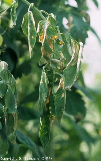 Les tout premiers symptômes sont parfois difficiles à relever lorsqu'ils traduisent une infection vasculaire. En observant les plantes avec beaucoup d'attention, on constate, en bordure du limbe ou entre les nervures de certaines folioles, la présence de plages de tissus vert pâle, voire livides, et parfois humides. Par la suite, ces tissus moribonds se nécrosent rapidement et se dessèchent (figures de 1 à 3). Ces zones de tissus nécrosés s'étendent et deviennent coalescents, entraînant la destruction de portions importantes de folioles, voire le dessèchement de ces dernières et de feuilles entières. L'enroulement de feuilles basses et leur flétrissement réversible durant la nuit trahissent aussi la présence de cette bactérie vasculaire. L'arrachage d'une plante permet de constater que le système racinaire est sain.