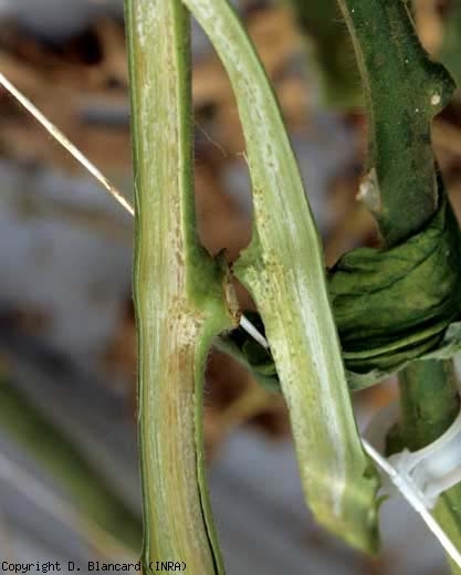 Les plantes fortement affectées produisent des fruits plus petits, mal colorés ou chutant prématurément. Une coupe transversale permet de constater des vaisseaux vasculaires souvent décolorés. Bien que la maladie puisse survenir à tout moment du cycle de développement de la tomate, c'est surtout lorsque la plante commence à porter des fruits qu'elle s'exprime particulièrement. Le délai entre les contaminations et l'apparition des premiers symptômes varient surtout en fonction des conditions climatiques. Il peut être assez court de l'ordre de 2 à 3 semaines et parfois atteindre au moins 3 mois. Dans bien des cas, plusieurs plantes contiguës sur le même rang sont affectées (figure 9). Cette répartition en ligne résulte de la transmission de la bactérie au cours des opérations culturales (taille, effeuillage, récolte).