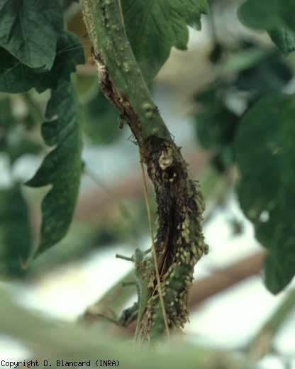 La maladie s'initierait à la base de la tige à l'approche de la récolte notamment, et monterait progressivement dans la plante. Certaines plantes particulièrement malades peuvent en mourir. Lorsque les conditions climatiques redeviennent clémentes et que les plantes sont légèrement atteintes, la maladie régresse. La répartition des plantes malades semble fluctuer en fonction des types de culture : plutôt distribuées au hasard en plein champ, elles ont été observées en foyers dans certains abris.