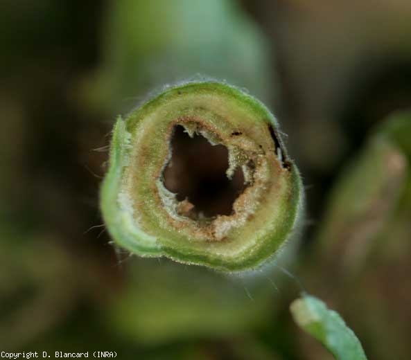 Les plantes affectées sont souvent très vigoureuses et présentent des tiges épaisses. Leur apex ne se développe plus et révèle des folioles recroquevillées, plus ou moins chlorotiques, flétrissant aux moments les plus chauds de la journée (figures 1 et 2).