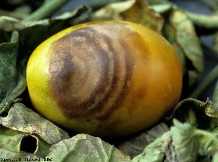 Les Oomycètes s'attaquent aussi aux fruits. Les Phytophthora spp. sont ainsi responsables de lésions irrégulières, humides, vert grisâtre à brunes, qui apparaissent sur la portion de fruit au contact du sol (figures 8 et 9) à . Elles évoluent assez rapidement et engendrent des motifs en anneaux concentriques, complets ou incomplets, brun clair à brun foncé. Ces lésions sont plutôt fermes, lisses en surface et ne présentent pas une marge bien marquée. Un feutrage mycélien cotonneux peut recouvrir les lésions en conditions humides (P. nicotianae, P. capsici, P. drechsleri. Les lésions occasionnées par P. mexicana présenteraient moins systématiquement des anneaux concentriques.