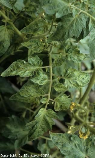 Comme pour le TMV, les symptômes occasionnés par le Tomato mosaic virus (ToMV) sont très variés et sont assez comparables. En plus d'entraîner un ralentissement de la croissance des plantes, diverses anomalies de coloration peuvent apparaître sur les folioles et les feuilles : un éclaircissement des nervures, une marbrure, une mosaïque plus ou moins contrastée, en plages vertes, jaunes, voire blanches (aucuba) (figures 1 et 2). Le limbe est également plus ou moins gaufré et crispé. Comme pour le TMV, les folioles et les feuilles sont filiformes en conditions hivernales, par manque de lumière des plantes cultivées sous abris.