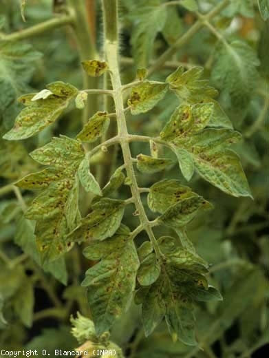 Par la suite, les zones affectées s'étendent et les folioles, plutôt chlorotiques, prennent une teinte bronzée à l'origine du nom de « maladie bronzée de la tomate » (figure 7). Il en est de même pour les taches nécrotiques qui confluent et entraînent la nécrose et le dessèchement de folioles entières. Des lésions nécrotiques (streak) peuvent apparaître sur les pétioles et les tiges. Après plusieurs semaines, les pieds malades peuvent être entièrement nécrosés. Des flétrissements sont parfois observés.