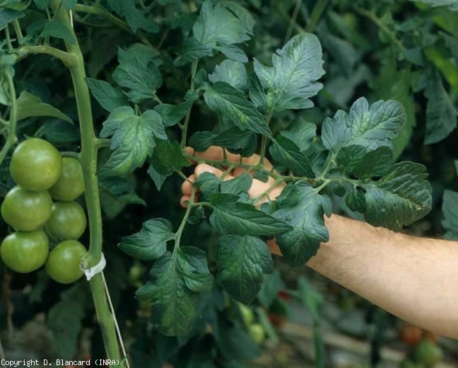 Les premiers symptômes causés par le virus de la chlorose de la tomate (Tomato chlorosis virus, ToCV) se manifestent sur les feuilles basses et intermédiaires de plantes réparties au hasard dans la culture. Ainsi, une marbrure chlorotique, voire des taches chlorotiques irrégulières, apparaissent entre les nervures des folioles et s'étendent progressivement (figures 1 à 3). Des petites altérations nécrotiques rougeâtres à brunes sont parfois visibles sur le limbe. Par la suite, le jaunissement gagne progressivement les feuilles supérieures . Au bout de quelques semaines, certaines plantes présentent une chlorose internervaire assez soutenue, généralisée à de nombreuses feuilles (figure 4), les nervures des folioles restant vert sombre et contrastant avec le reste du limbe. Les plantes finissent par vieillir prématurément ; les vieilles feuilles s'épaississent, s'enroulent et deviennent cassantes. Elles sèchent parfois.