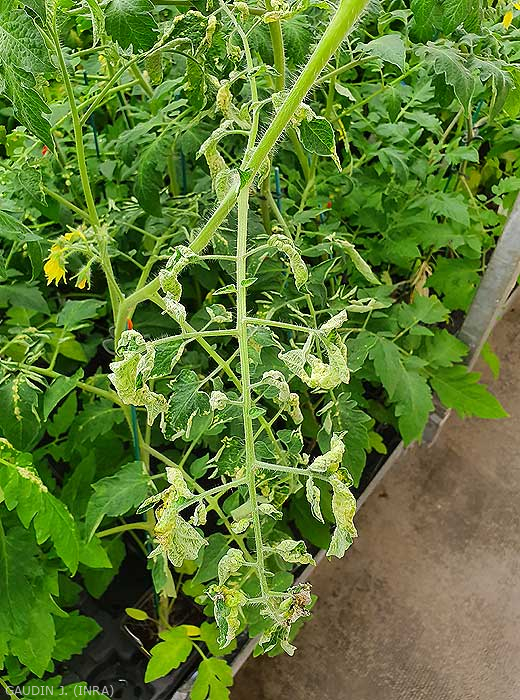 Des taches chlorotiques plus ou moins réparties à proximité des nervures apparaissent fréquemment sur les feuilles les plus basses (figure 1). En fait, ces taches se forment lorsque l'équilibre hydrique entre l'absorption racinaire et l'évapotranspiration des plantes est perturbé, ces dernières absorbant plus d'eau qu'elles ne peuvent en éliminer dans les conditions de l'abri. Il s'ensuit alors une saturation en eau des tissus foliaires à l'origine des intumescences. Celles-ci correspondent à des îlots de cellules, localisés à la face inférieure du limbe, qui se sont « gorgées » d'eau, entraînant parfois une rupture de l'épiderme. Ainsi des oedèmes à l'apparence humide à huileuse se forment (figures 2). Par la suite, les cellules finissent par éclater et les tissus subérisant prennent une teinte brunâtre (figure 3). De plus, lors de conditions particulièrement humides, la présence de très nombreuses intumescences entraîne la déformation et l'enroulement de nombreuses folioles (figure 4). Sachez aussi que des intumescences peuvent aussi se former sur la tige (figure 5), les pétioles et les inflorescences (figure 6).