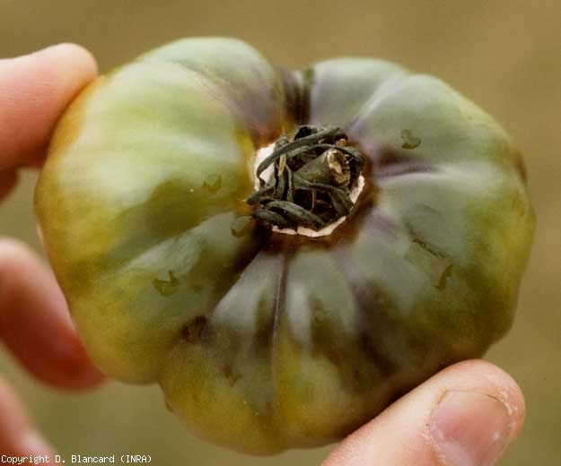 Ce champignon est à l'origine de lésions sombres, marbrées de veines brunes, qui apparaissent près de la cicatrice pédonculaire des fruits (figures 1). Celle-ci, en plus d'être auréolée d'une zone brune, se couvre d'une moisissure rose pâle. Cette moisissure est constituée des longs conidiophores arbusculeux du champignon portant des conidies bicellulaires, lisses et hyalines, allongées ou pyriformes (figures 2 et 3). D'une manière générale, les fruits affectés peuvent tomber prématurément. Trichothecium roseum peut synthétiser une mycotoxine dans les tissus altérés : le trichothécène.