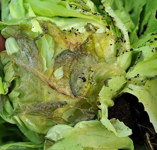Quelles que soient les parties des salades touchées, les tissus affectés se couvrent d'une moisissure grise (figures 14 et 15) très caractéristique constituée des conidiophores et des conidies du champignon. Des sclérotes noirs (2 à 5 mm de diamètre) (figure 16) sont de temps en temps visibles sur les mêmes tissus. On observe parfois la formation d'un mycélium cotonneux blanc sale pouvant être confondu avec celui des Sclerotinia spp.