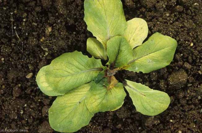 En cours de culture et à l'approche de la récolte, ses attaques peuvent se matérialiser par de brusques flétrissements de plantes (figure 1), isolées ou en foyers, consécutifs à une altération du système vasculaire. Comme nous l'avons dit précédemment, il affectionne les vieilles feuilles sénescentes qui se trouvent sous le couvert végétal (figures 2 et 3) et en contact avec le sol après la pommaison. Il les envahit rapidement, produisant une pourriture humide, marron à brune. Cette pourriture gagne les autres feuilles saines contiguës et le collet (figure 4) qui est altéré plus ou moins profondément. Les vaisseaux sont ainsi touchés (figure 5) et les plantes peuvent flétrir et/ou dépérir progressivement ou brutalement en fonction des conditions climatiques (figures 6 à 8).