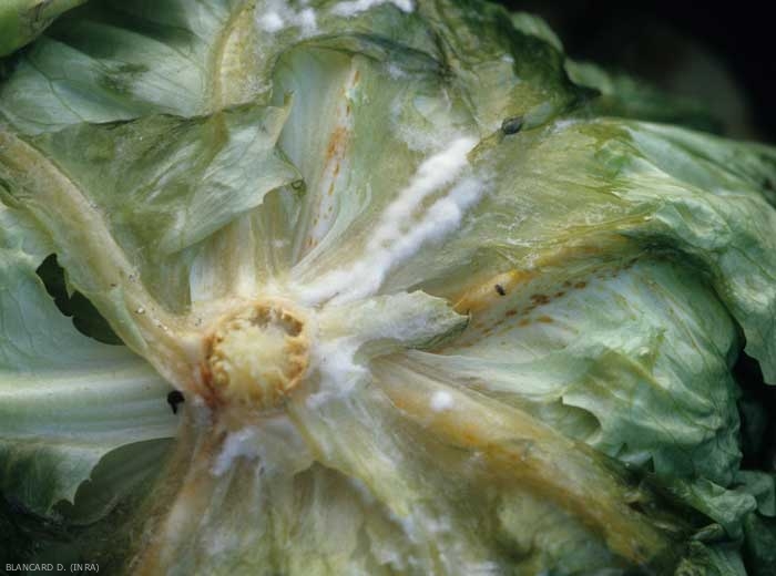 Par le passé, il a également été signalé des flétrissements lents et tardifs de salade, consécutifs à des attaques de Sclerotinia minor plus en profondeur dans le sol. Ce dernier occasionnait une altération brune du pivot, 5 à 10 cm au-dessous de la surface du sol.