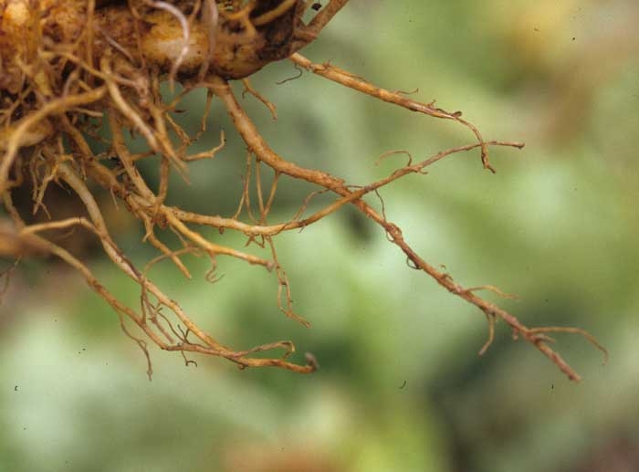 Pratylenchus spp. cause de nombreuses lésions de taille variable apparaissent sur les racines. Leur coloration varie du jaunâtre au brun rougeâtre (figure 1). Cette dernière coloration est liée à la formation de composés phénoliques dans les tissus. A terme, des portions plus ou moins importantes du cortex se décomposent (figure 2). Lorsque les attaques sont sévères, une forte proportion du système racinaire peut disparaître (figure 3).