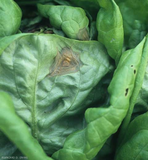 Plutôt inféodé aux feuilles basses des salades (voir le lien Altérations des feuilles basses et du collet), Botrytis cinerea est capable de produire des contaminations aériennes qui se traduisent par l'apparition de larges taches sur les feuilles de la pomme des salades (figures 1 et 2). Celles-ci s'étendent rapidement lorsque les conditions climatiques sont favorables ; elles peuvent donner lieu à la pourriture d'une forte proportion de la pomme en cours de culture ou durant le stockage des salades (voir le lien Taches poudreuses et moisissures). De discrets conidiophores portant de nombreuses conidies sont parfois visibles sur les tissus.