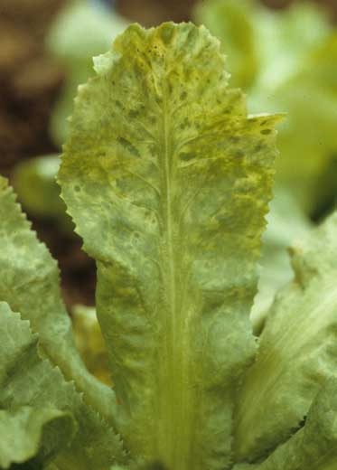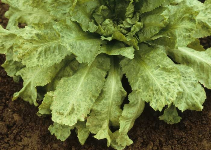 Sur batavia type iceberg, une marbrure en larges plages jaunes, circulaires à irrégulières, apparaît sur les feuilles âgées et intermédiaires (figures 1 et 2). A terme, les feuilles les plus âgées deviennent souvent complètement jaune vif, parfois quelques secteurs foliaires restent verts. Le limbe se nécrose fréquemment. Contrairement au BWYV, les nervures ne restent pas vertes et les feuilles ne deviennent pas cassantes (figure 3). Les feuilles intermédiaires présentent une mosaïque déformante jaune et verte, accompagnée de petites taches nécrotiques (figure 4). La croissance de la plante est affectée dans tous les cas. Si les plantes sont infectées à un stade juvénile, elles resteront rabougries et déformées (figure 5) ; elles pourront mourir.