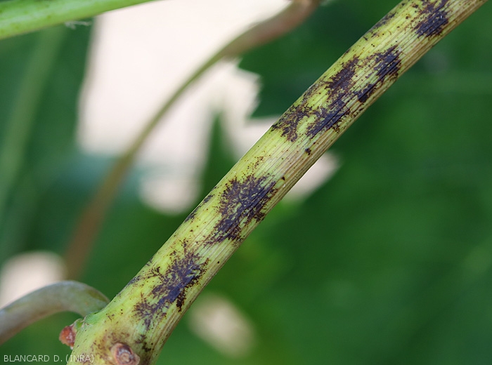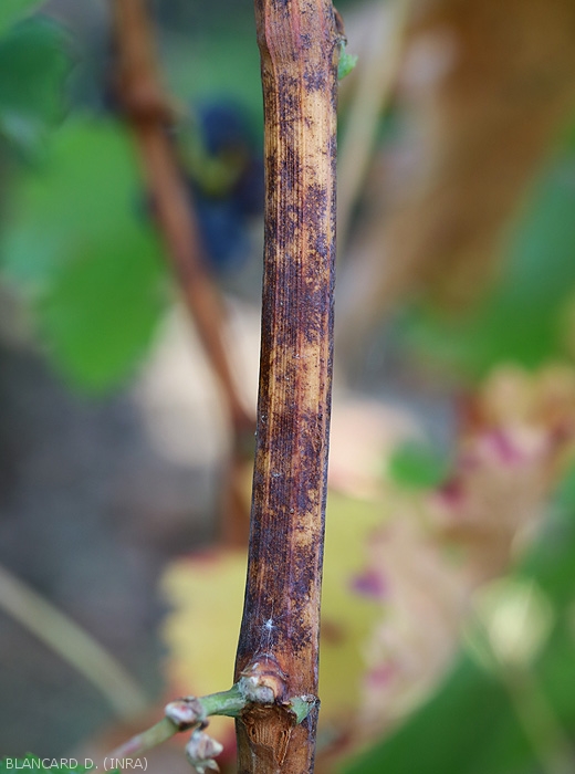 Les jeunes rameaux sont également colonisés par E. necator. Couverts par son mycélium, ils présentent des taches, voire des plages irrégulières et mal définies plus ou moins poudreuses. L'aoûtement des rameaux oïdiés est souvent partiel et à l'automne, les zones affectées par E. necator prennent une teinte brunâtre à noirâtre toujours visible durant l'hiver (figures 7 et 8).