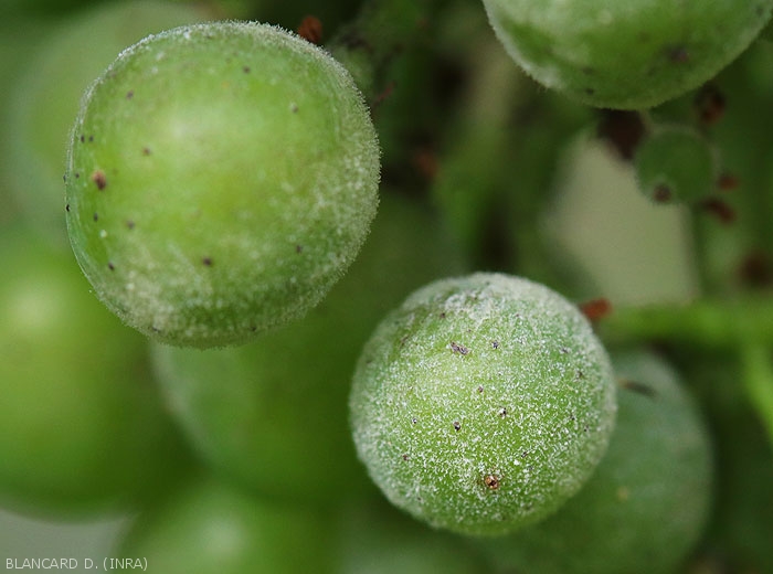 La gravité des attaques d'oïdium sur baies est très dépendante de l'intensité et de la précocité des infections survenant à partir de la floraison. Ajoutons que le développement d'E. necator se réduit progressivement au fur et à mesure que la teneur en sucre et en anthocyanes des baies augmente.