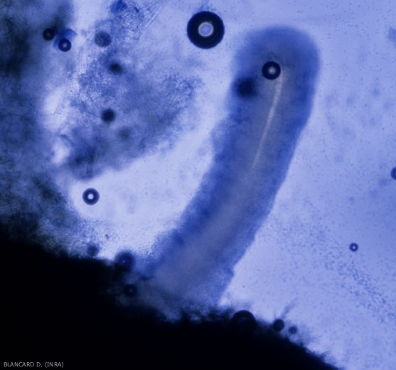 • La forme imparfaite (anamorphe), Libertella blepharis. A. L. Smith, se caractérise par des pycnides noires (figure 5), sub-globuleuses de 200 à 300 µm, se formant sur le bois généralement dans les zones où plus tard apparaîtront les périthèces. Ces pycnides émettent un cirrhe (sorte de fin cordon gélatineux) (figure 6) dans lequel sont noyés des stylospores (pycniospores) arquées caractéristiques mesurant 18-25 x 1 µm (figure 7).