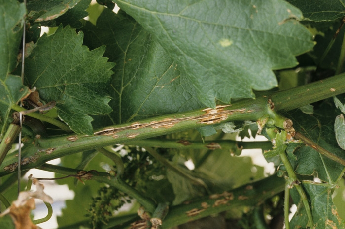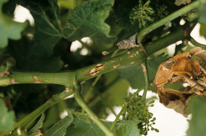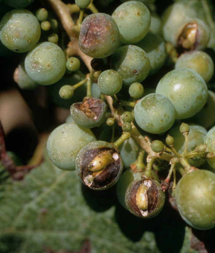- Les baies peuvent brunir et se ratatiner ou présenter des éclatements permettant à Botrytis cinerea ou à d'autres microorganismes responsables de pourritures de s'y développer (voir les Pourritures de la grappe). Si les conditions climatiques sont humides dans les jours qui suivent les dégâts sur baies, un traitement anti-Botrytis peut s'avérer utile.