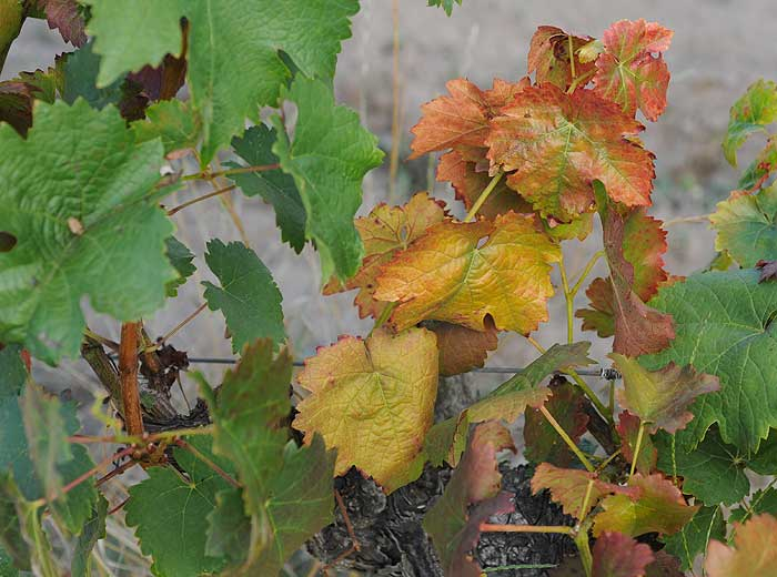 - A la véraison, les limbes des feuilles se durcissent et deviennent cassants, se décolorent (les cépages blancs jaunissent, les cépages rouges rougissent) (figures 3 et 4) et présentent un enroulement plus ou moins accentué selon les cépages. Les grappes peuvent manifester un dessèchement des baies à partir de la rafle. Si l'on s'intéresse à la qualité organoleptique des baies produites par les ceps malades, celles-ci sont fibreuses ce qui leur confère un goût amère et aigre. Il est bien évident que le vin produit par la suite est de piètre qualité et souvent difficilement commercialisable.