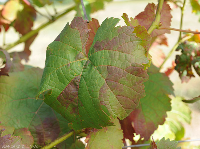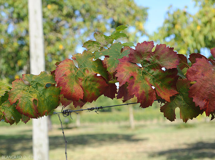 Les porte-greffes (cultivés en vignes mères ou les repousses sauvages) expriment peu les symptômes alors qu'ils peuvent être porteurs de phytoplasmes.