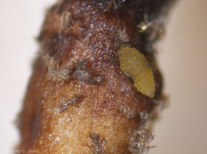 • Le cycle épigé se déroule sur les organes aériens de la vigne, en particulier sur les organes non lignifiés du végétal. Les fondatrices éclosent des oeufs d'hiver au début du printemps. Elles colonisent les feuilles apicales via leur face supérieure et la bordure du limbe, et forment des galles. Le premier stade larvaire est mobile, de couleur jaune clair et de forme conique. Pendant toute la durée de sa vie, la fondatrice va pondre de 550 à 600 oeufs jaunes (figure 1) présentant une surface lisse ou réticulée.