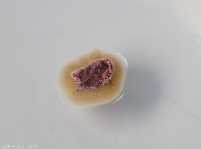 - une forme sexuée ou téléomorphe sous la forme de stromas brunâtres plus ou moins immergés dans les tissus végétaux. A l'intérieur de ces stromas, on peut observer plusieurs cavités (ou locules) contenant des asques globuleux à ovoïdes, voire ellipsoïdes, mesurant 80-100 x 11-23 µm. Ils enferment huit ascospores brunes à noires, mesurant entre 29-35 x 4,5-7 µm et montrant 3 cloisons.