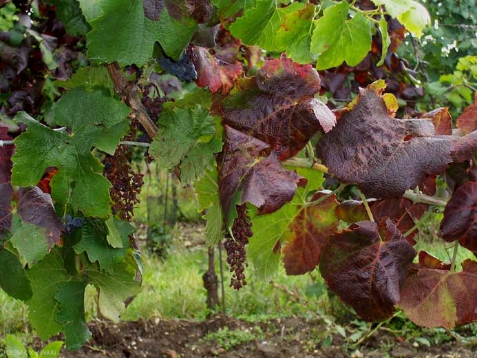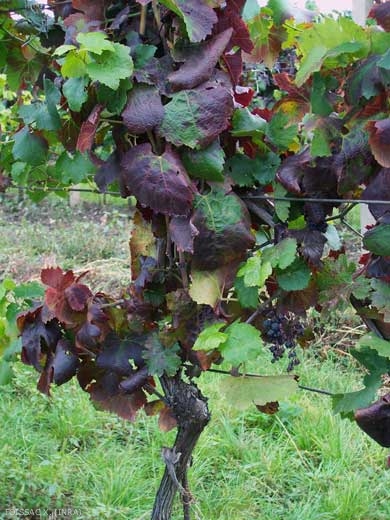 • à la véraison, le limbe des feuilles se durcit et devient cassant, se décolore (les cépages blancs jaunissent, les cépages rouges rougissent) (figures 2 et 3) et s'enroule plus ou moins selon les cépages. Les grappes peuvent manifester un dessèchement des baies s'initiant à partir de la rafle. Si l'on s'intéresse à la qualité organoleptique des baies produites par les ceps malades, celles-ci sont fibreuses ce qui leur confère un goût amère et aigre. Il est bien évident que le vin produit par la suite est de piètre qualité et souvent difficilement commercialisable.