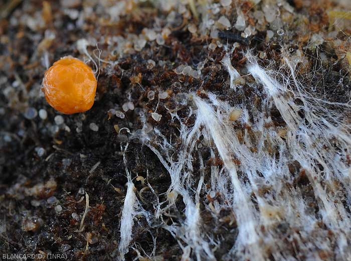 Conservation : persiste plusieurs années plutôt en surface du sol sur les débris végétaux, sous la forme de mycélium agrégé (figures 1 et 2), mais surtout de sclérotes (figures 3 à 6) libres ou ou associées aux débris végétaux. Ce champignon est aussi capable de se maintenir sur différents substrats organiques.