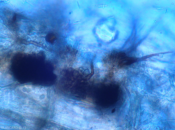 il produit des acervules intra- ou sous-épidermiques, matérialisant sa multiplication asexuée (figures 1 à 3)., ainsi que de nombreux sclérotes brun foncé à noirs.
