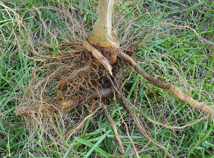 Organes attaqués: principalement les racines qui peuvent être entièrement colonisées.