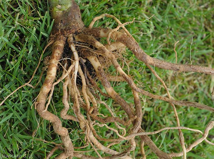 - Lésions sur radicelles, particulièrement sensibles, qui brunissent, se dégradent rapidement et disparaissent.