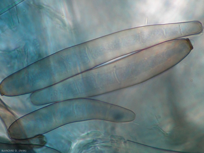 - Sporulation : forme de nombreuses spores caractéristiques allongées sur les tissus lésés (figures 1 à 4).