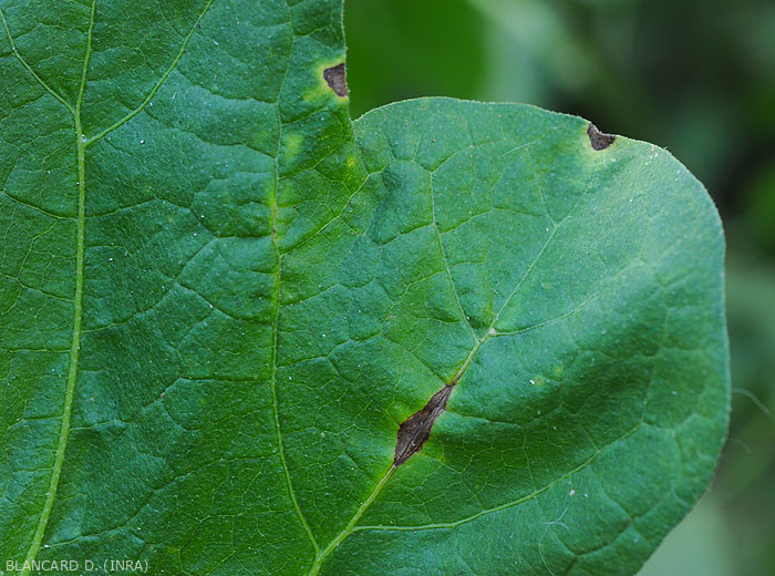 - Petites taches vert clair, brunissant et se nécrosant progressivement, parfois délimitées par les nervures, peu zonées atteignant 1 cm de diamètre, plus ou moins auréolées d'une marge chlorotique.