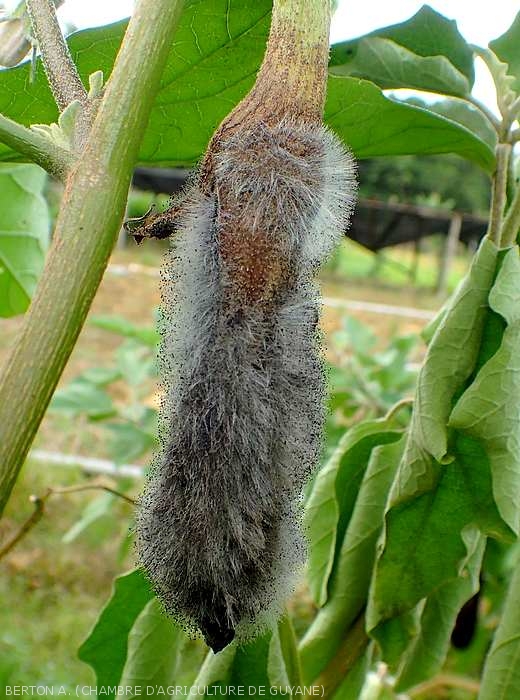 Signes: une moisissure noirâtre et aérienne recouvre plus ou moins les tissus pourris. Des fructifications en forme de minuscules têtes épingle noires sont visibles.