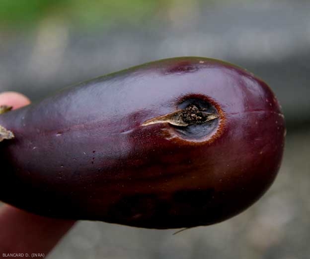 - Pourritures sur fruits d'aubergine, les tissus affectés prennent une teinte sombre, s'effondre plus ou moins et se recouvrent d'une moisissure de couleur vert sombre à noire.