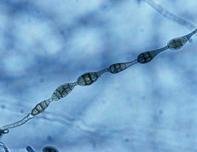 - Sporulation : produit sur les tissus colonisés de nombreux et courts conidiophores surmontés de conidies pluricellulaires en forme de massue, formant de longues chaînes.