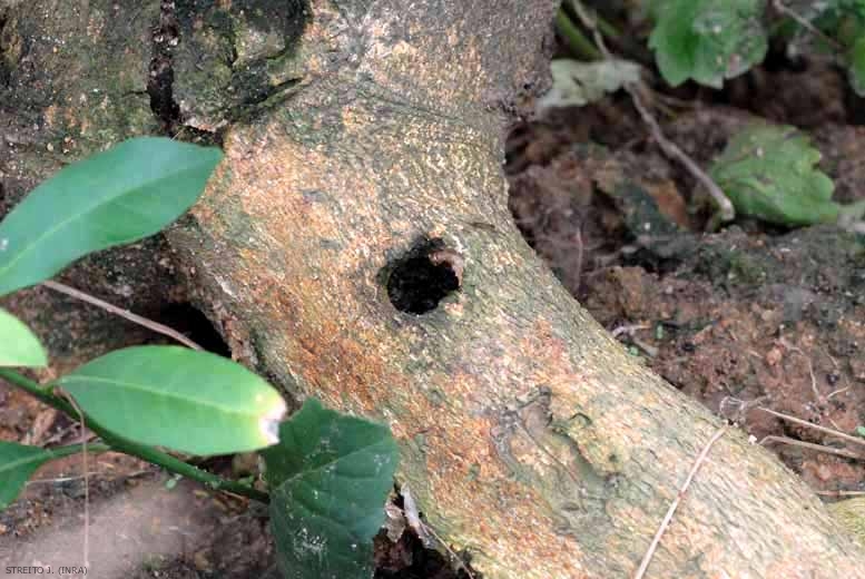 - Types de dégâts et symptômes : présence de galeries ou de mines pouvant entrainer un dépérissement total (jeunes sujets) ou partiel (branches) des arbres ou arbustes attaqués.