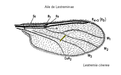 - M1 + M2 présentes formant une fourche; ailes avec 4 à 6 nervures longitudinales (maximum 7) atteignant le bord de l'aile, Lestreminae (figure 1)