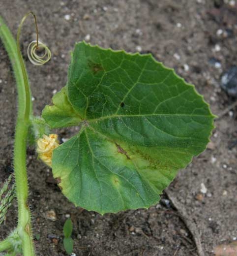 Des petites lésions humides apparaissent sur les feuilles souvent les plus jeunes. Ces lésions s'étendent progressivement pour former des taches plus ou moins circulaires, brunissant et se nécrosant en vieillissant. Elles peuvent prendre parfois une teinte grisâtre et être auréolées d'un halo jaune plus ou moins large. Les tissus affectés peuvent se détacher et tomber, conférant à la partie interne des taches un aspect plus ou moins étoilé, et au feuilles une apparence criblée. Notons que les lésions humides s'initient parfois à partir de nervures qui brunissent localement. Sur feuilles de melon (figures 2 à 7), des taches brunes, petites et nécrotiques apparaissent. Elles peuvent être également grisâtres, brunes en périphérie, parfois anguleuses, entourées d'un halo jaune. Des nécroses nervaires brunes se forment également.