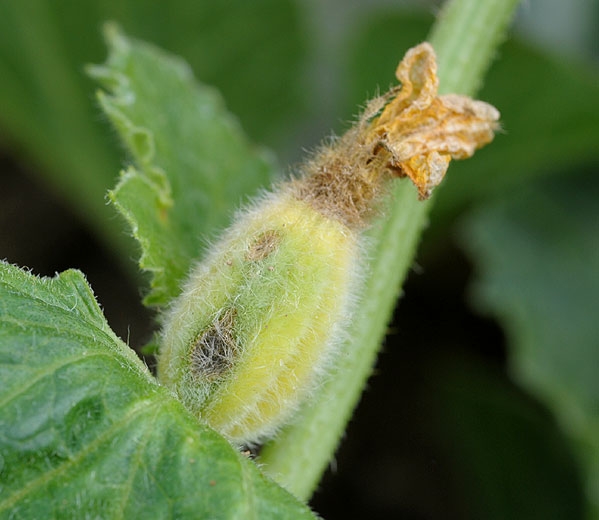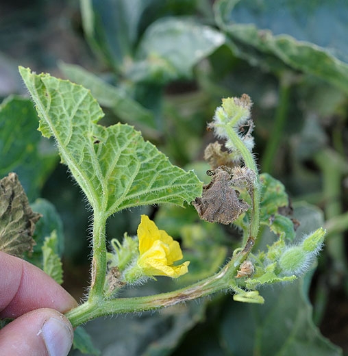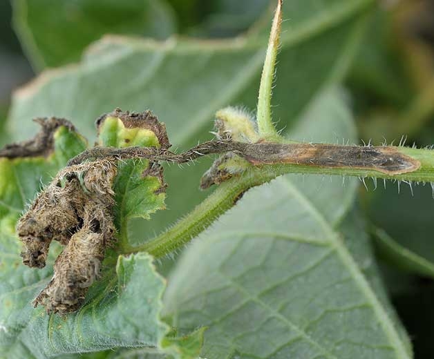 Sur les tiges et les pétioles, des lésions allongées se développent. Elles sont aussi humides dans un premier temps et brunissent progressivement. Leur taille fluctue en fonction des espèces et des conditions climatiques. Notons qu'une substance visqueuse perle parfois des tissus infectés. Sur les tiges de melon (figures 8 et 10), on observe des petits chancres déprimés beiges, en forme de « lèvre ». Avec le temps, ces chancres deviennent elliptiques, marron clair, et un duvet vert sombre les recouvre dans leur partie centrale.