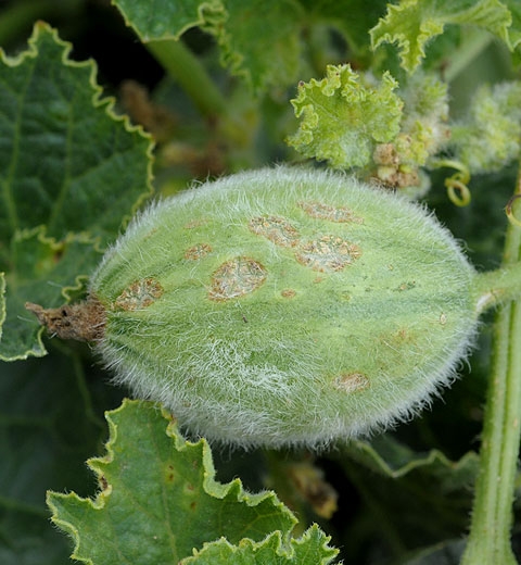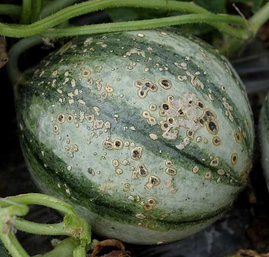 Sur melon (figures 13 à 21), les taches, petites et huileuses dans un premier temps sur jeunes melons, s'étendent, s'allongent, et subérisent localement. Des fructifications du C. cucumerinum se forment au centre des taches et leur confèrent une coloration vert sombre à noire.