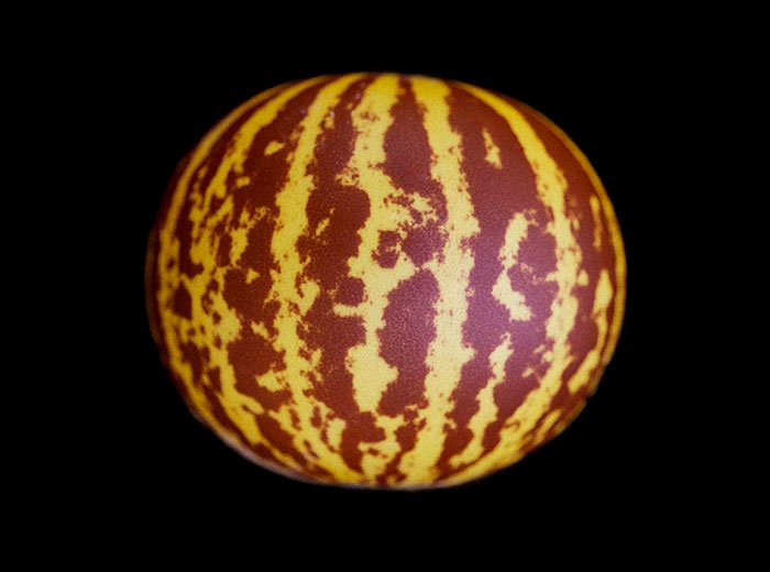 - Fruit rond, petit (taille d'une orange), jaune avec des rayures ocre, avec une écorce lisse et veloutée.Très aromatique.