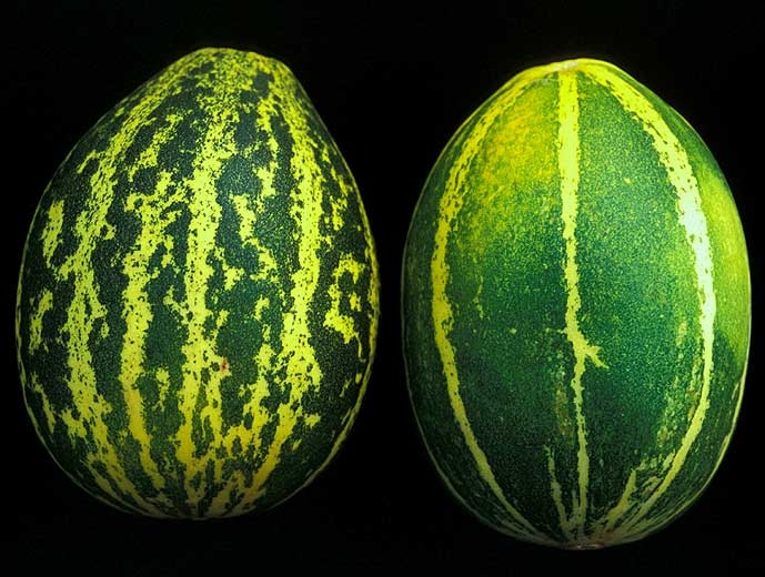 - Fruit ovale, lisse, de petite taille (300 g) de couleur vert sombre avec rayures vert clair ou jaune.