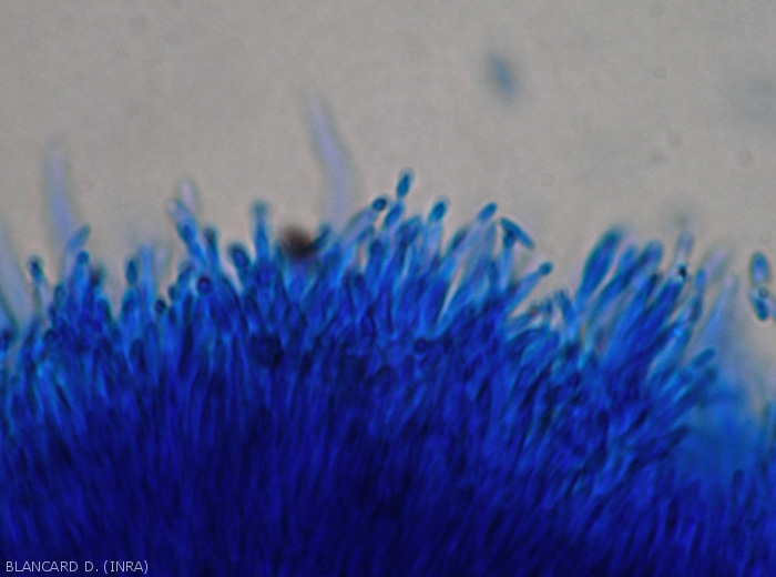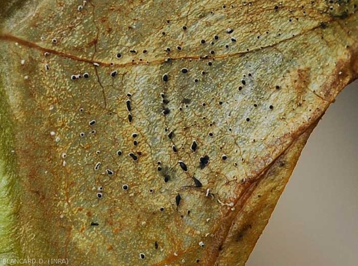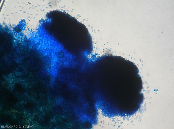 Sur les parties altérées, M. roridum fructifie sous la forme de discrètes masses (des sporodochies) grisâtres à noires (figure 7).