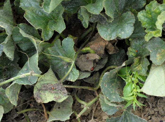 Ce miellat sucré est une véritable aubaine pour plusieurs champignons du phylloplan de nombreuses plantes et du melon qui l'utilisent pour se nourrir, et qui sont à l'origine de la fumagine (sooty mold). Leur développement sur ce substrat sucré conduit à l'apparition progressive d'une à plusieurs moisissures sur le limbe (figures 1 et 2), la tige (figure 3) et même les fruits (figure 4) qui présentent des teintes variables en fonction des espèces fongiques colonisatrices Alternaria spp., Cladosporium spp., Capnodium sp., Penicillium sp. ...