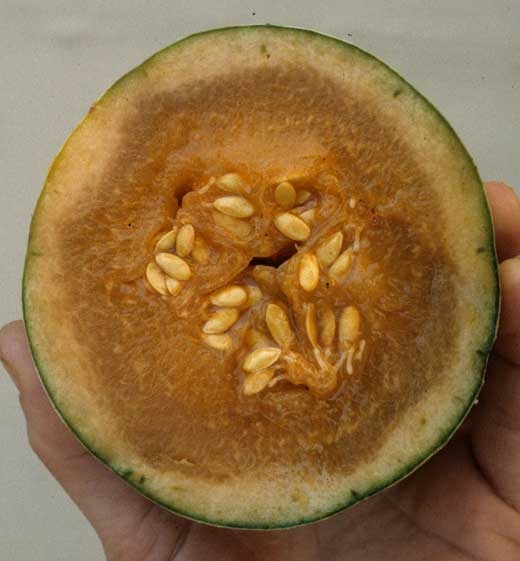 Cette maladie non parasitaire des fruits du melon se caractérise par l'aspect vitreux que prend une partie de la chair située entre l'écorce et la cavité contenant les graines (figure 1). Celle-ci acquiert assez rapidement un aspect gorgé d'eau, devient déliquescente, et dégage une odeur de fermentation alcoolique. L'extérieur du fruit reste sans symptôme assez longtemps, tandis que le phénomène gagne l'ensemble de la chair. Par contre, une altération humide est visible à la surface du fruit à un stade très avancé de vitrescence (figure 2).