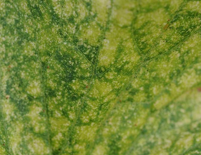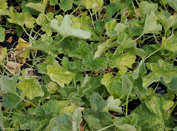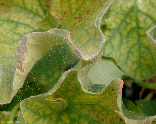 De minuscules taches chlorotiques plus ou moins dispersées sur le limbe des folioles de melon (figure 1). Ce dernier jaunit progressivement et prend une teinte terne. Lors d'attaques sévères, certaines feuilles peuvent jaunir, flétrir et se dessécher. De délicates toiles soyeuses sont visibles au sein du couvert végétal.