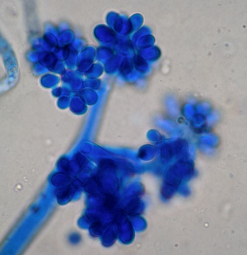 Sur tous ses hôtes comme sur les débris végétaux, il produit une moisissure grise constituée de mycélium et de nombreux conidiophores longs et ramifiés (figures 1 et 2). À leurs extrémités naissent des conidies ovoïdes à sphériques qui assurent la dissémination de B. cinerea (figure 2 et 3). La sporulation peut débuter 3 jours après les premières contaminations. La dissémination s'effectue surtout par l'intermédiaire du vent et des courants d'air, à un moindre degré de la pluie et des éclaboussures d'eau. Elle est aussi assurée par les ouvriers au cours des opérations culturales. Le mycélium est à l'origine de contaminations par contact de tissus malades à tissus sains. B. cinerea peut finir par produire sur les tissus altérés des petits sclérotes plats qui permettent aussi sa conservation (figure 4). En conditions favorables, la durée d'un cycle est assez courte ; de l'ordre de 4 jours.
